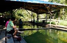 クチン市内より、1時間ほどに、2箇所の温泉地があります。ビダユ族のアナ・ライス村の温泉は、サラワク川の源流に近い場所で、川の中で温泉風呂があります。もう一つは、スリアン少し手前のパンチョー(Pancor)温泉で、こちらは村で経営している温泉小屋があります。いい湯だな~~、ははん!!